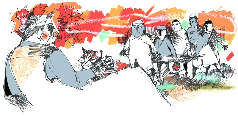 Bình thường mỗi đêm, con mèo hoang trở về. Tiếng nó kêu rất nhẹ và nhỏ nhưng bằng linh cảm ông nghe được. Ông mở cửa cho nó ăn. Con mèo tam thể đến nhà ông vào một buổi chiều muộn ông chạy xe về. Con mèo co ro nép bên hàng rào vẻ như nó đang rất sợ sệt điều gì đó mà ông cảm được nỗi hãi hùng còn vương trong đôi mắt nó. Con mèo thốt lên tiếng kêu yếu ớt khi ông vuốt đầu nó. Ông vào nhà lấy ra chút thức ăn nhưng con mèo lấm lét ngửi rồi quay đi. Ông thấy rõ thân hình nhỏ bé của nó đang run từng cơn. Ông khá lúng túng trong trường hợp này. Cuối cùng con mèo run rẩy rời đi. Điều này làm ông bất an. Ngày hôm sau, ông ra siêu thị mua ít thức ăn mèo để sẵn và hết đi ra lại đi vào ngóng chờ nó đến.