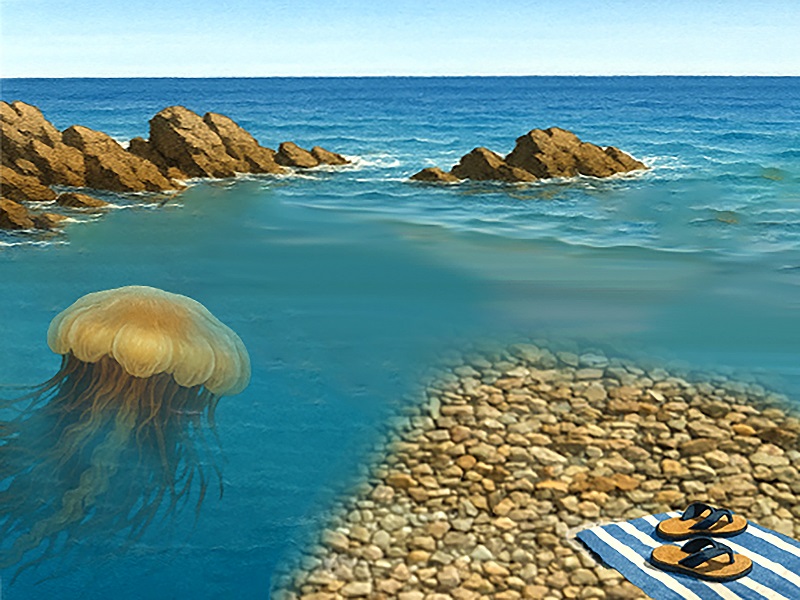 Hai chúng tôi khênh một tảng đá lớn thả xuống chỗ con sứa nằm. Khối đá chừng hơn tạ đè nhẹp con vật quái ác… Vài tua lông vươn lên, một thứ nước nhầy nhụa màu nâu loang ra lan rộng như vết máu…