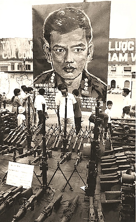 Chân dung tưởng niệm Đại tá Nguyễn Đình Bảo với vũ khí Việt cộng tịch thu trưng bày trên sân vận động Hoa Lư, ĐaKao.