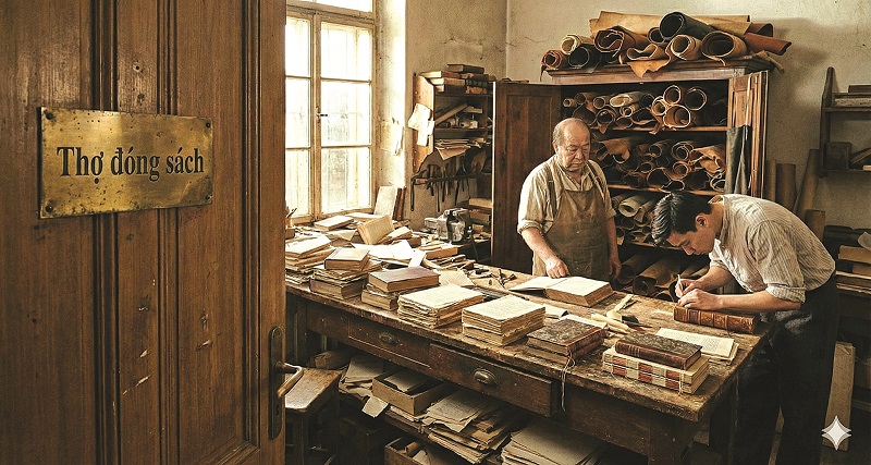 Khách đi theo lối chỉ dẫn, vượt khoảng sân nhỏ ướt át. Vài con mèo đói chờn vờn bên chiếc thùng rác… Mùi xào nấu từ phía nào thoảng ra. Phải leo vài bậc gạch nữa mới tới khung cửa có miếng đồng hoen rỉ khắc chữ “Thợ đóng sách”. Khách bấm chuông…