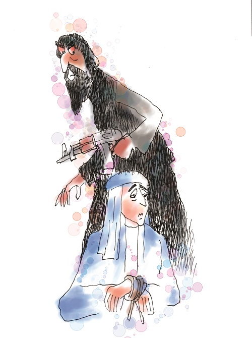 Ông Taliban cao, ốm tong teo, mặc áo choàng đen, bịt mặt, tóc tai bờm xờm, hàm râu quai nón dài xuống tới ngực. Nhìn giống như thợ tống táng của nhà đòn. Ông ngồi trên bìa giường sắt, tay chống khẩu AK. Trước mặt là chị Á Rập đang quỳ, hai tay bị trói, thằng nhỏ chừng 10 tuổi, mặt mày tèm lem, mặc bộ đồ màu trắng đã ngả vàng, đứng khóc sau lưng.