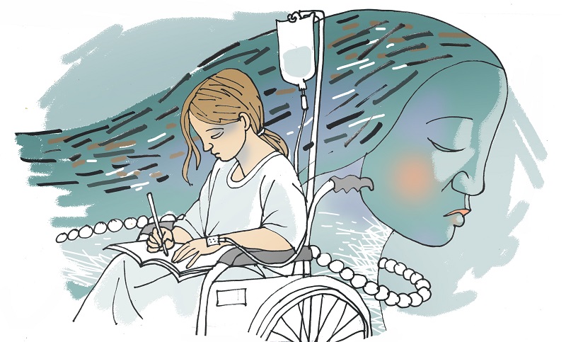 Mẹ có nhớ hôm đó mẹ phải gởi con cho bà trên lầu để đi vào bệnh viện không? Bây giờ con cũng thế, con đang nằm ở bệnh viện dành cho trẻ em, buồn lắm, chỉ thấy 4 bức tường vàng, đến giờ được gọi dậy ăn cơm, thế thôi; đứa nằm bên cạnh giường, thằng Stephan nó chờ thay gan, đứa nằm bên trái, con Kate bị sốt hoài như con, nhưng nó may mắn có cha mẹ vào thăm luôn, còn con thì chờ quả thận, chờ một năm nay rồi, con có cầu Chúa mỗi tối, con mong ngài sẽ cho con thêm sức mạnh… để chờ…