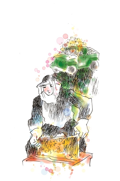 Juana lấy trong thùng, những tấm lưới, đầy mật. Chị cầm cây gỗ dẹp. Vuốt lớp mật vô thùng nhựa lớn, để dưới chân.