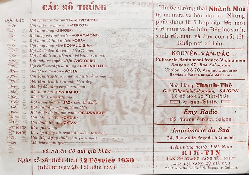 Theo tư liệu, hồi đầu những năm 1930, người Pháp đã tổ chức các cuộc xổ số rồi. Các giải thưởng của loại vé số này không trả bằng tiền mà là hiện vật, bao gồm: một chiếc xe hơi hiệu Citroen trị giá 2,850 đồng, chiếc xe gắn máy giá 750 đồng. Ngoài ra còn có tủ sắt, máy may, xe đạp, máy hát, đồng hồ bấm giờ… Nói chung xổ số để gây quỹ từ thiện là chính. Rồi các hội đoàn xã hội người Việt bắt chước tổ chức các cuộc xổ số trúng thưởng thường xuyên để giúp các trại tế bần.